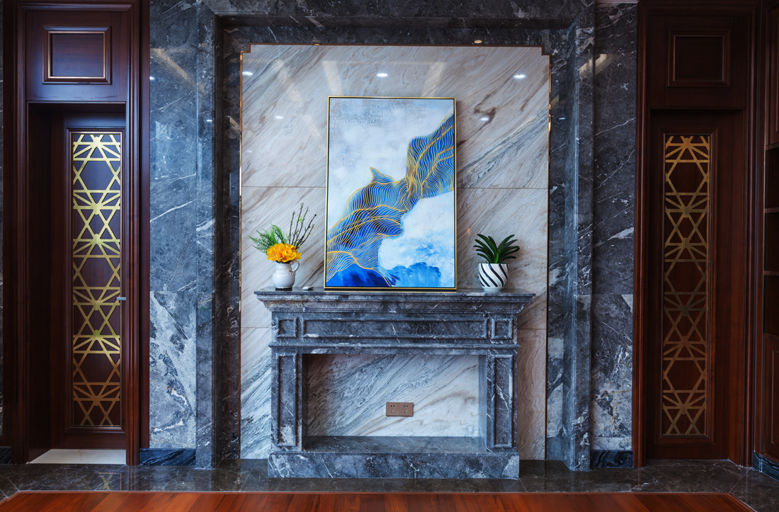 主要材料:意大利灰大理石,白金沙大理石,柚木木皮,藝術墻布