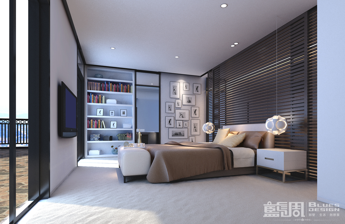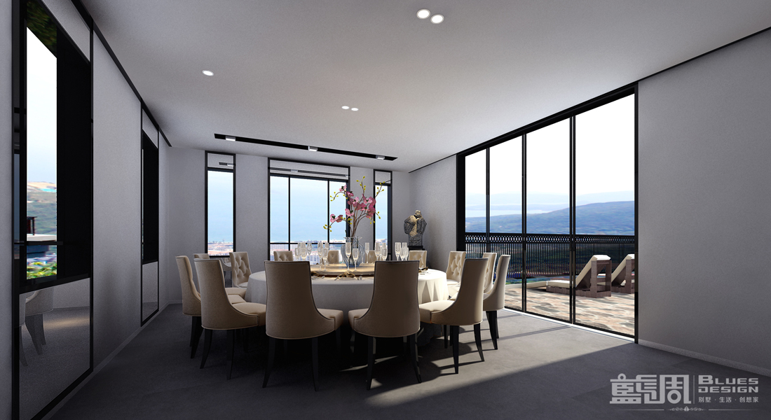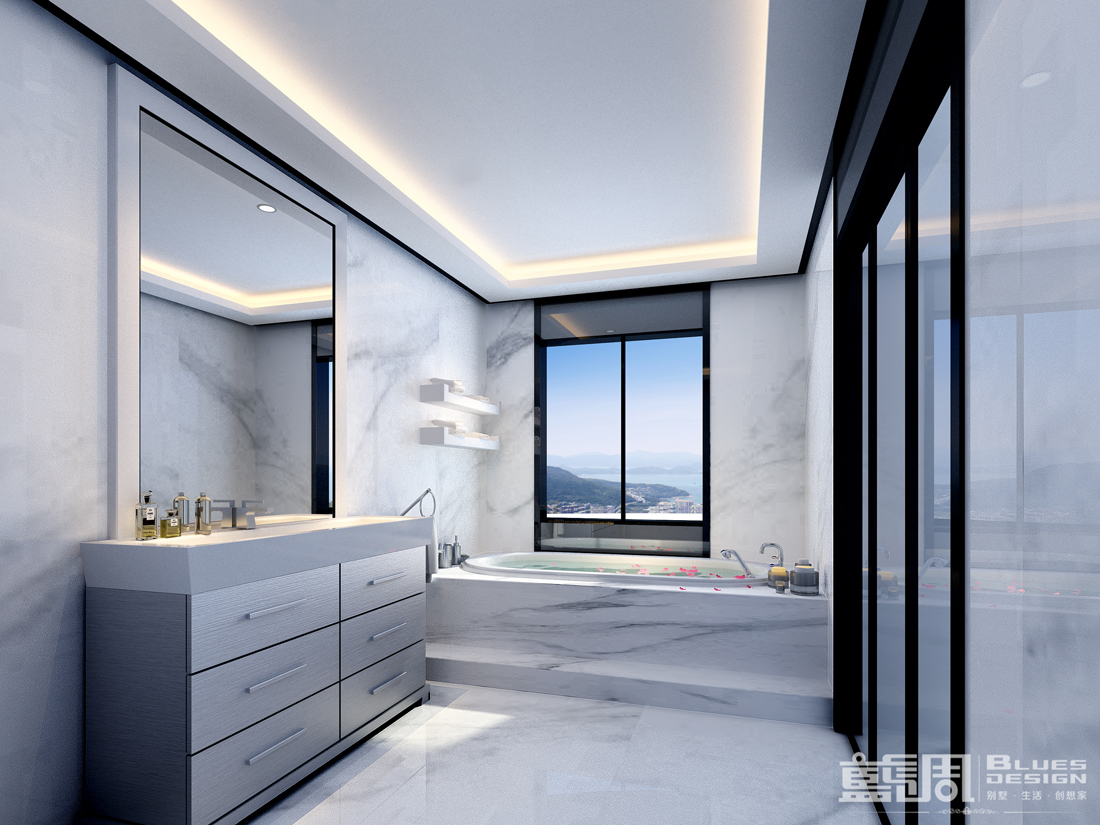 本案例深圳藍調別墅設計的設計師采用“有機主義”的創作手法,設計主張人、建筑、空間與自然形成有機和諧的關系。“青山,大海,陽光,空氣,風兒”等自然地貌組合成一幅幅美妙的水墨畫卷,自由舒緩地向大地展開。