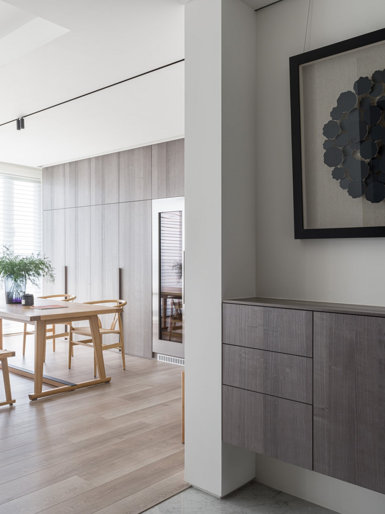 四季的腳步不疾不徐地透過水岸景色佇立在窗臺前,自水岸漫上無限輕柔與自在,透過大面落地窗在漫白的屋里鋪陳各式生活的面向。