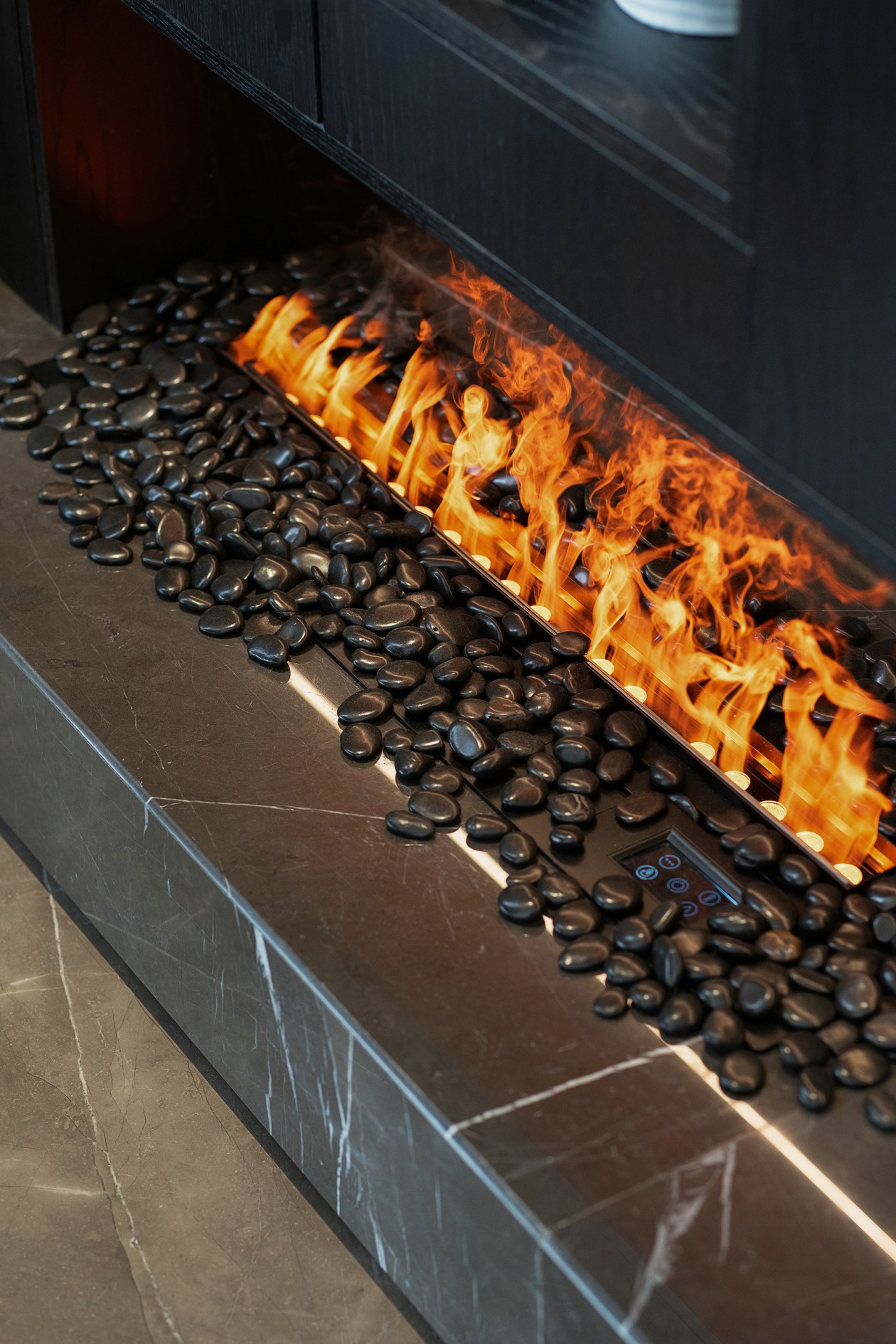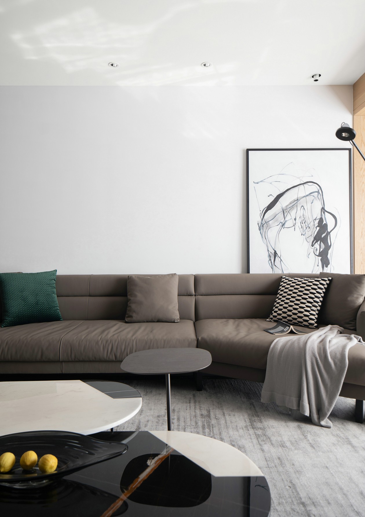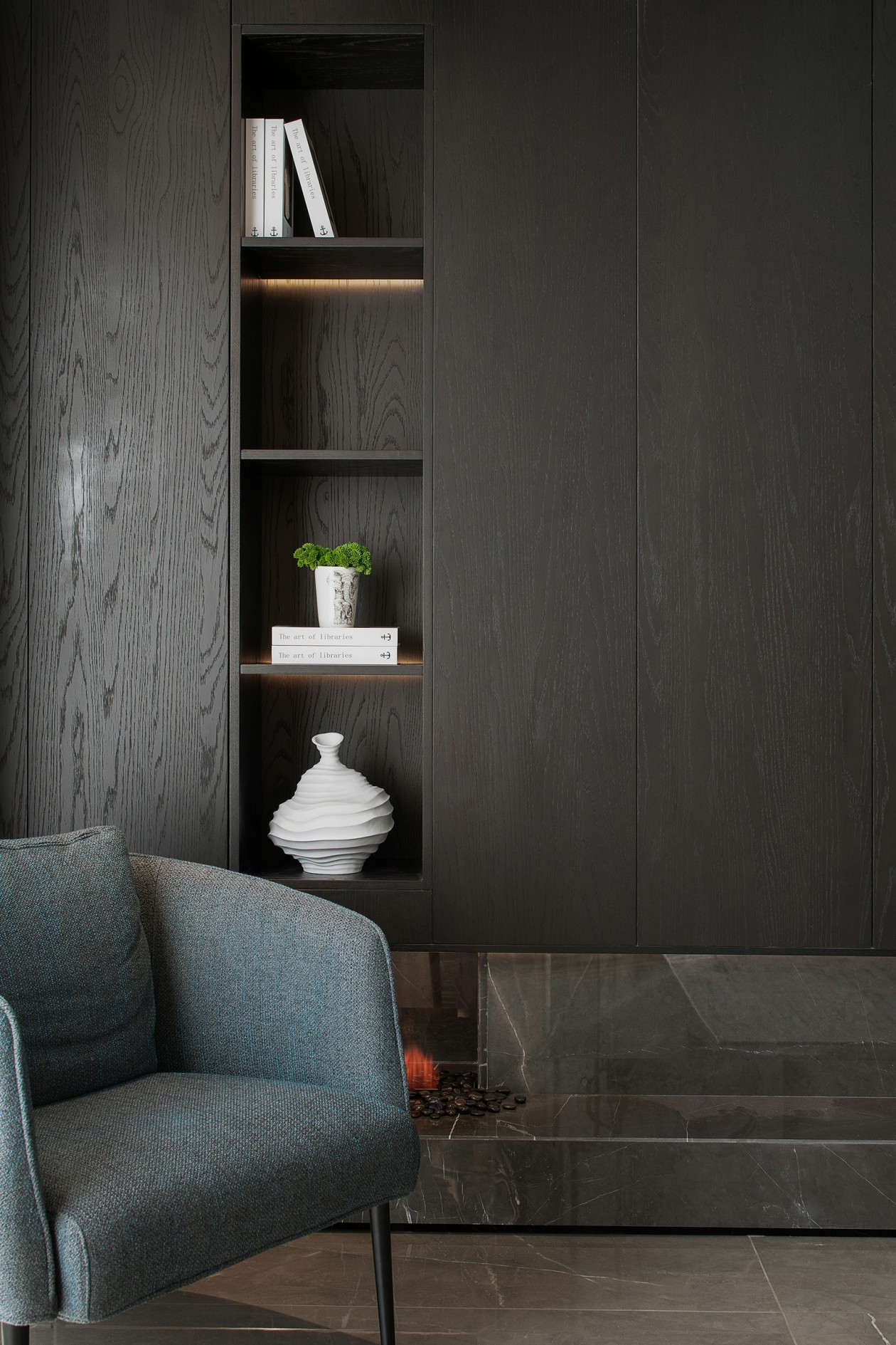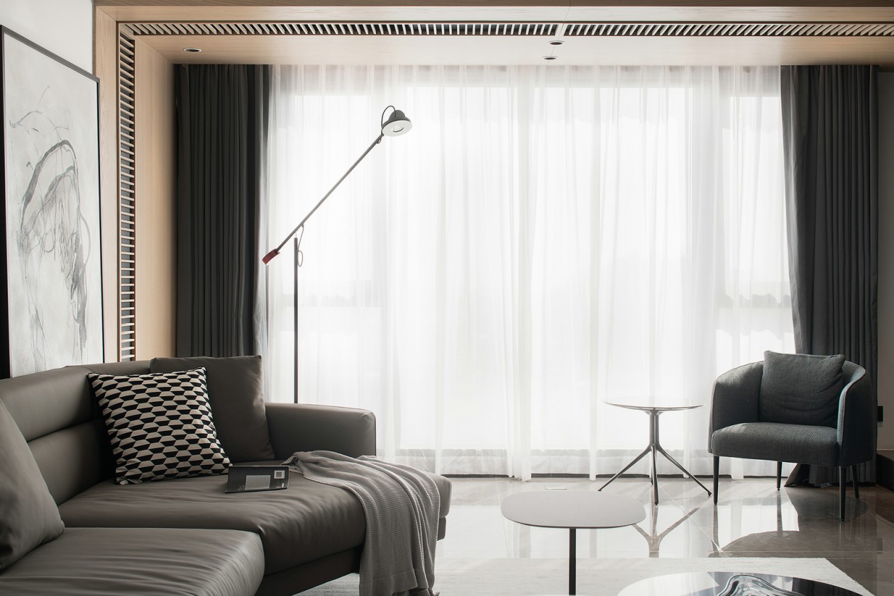 從上至下,各種材質觸感溫潤細膩,搭配線條簡單的落地燈以及圓潤的鵝卵石壁爐,展現個性又不失生活的溫柔。
