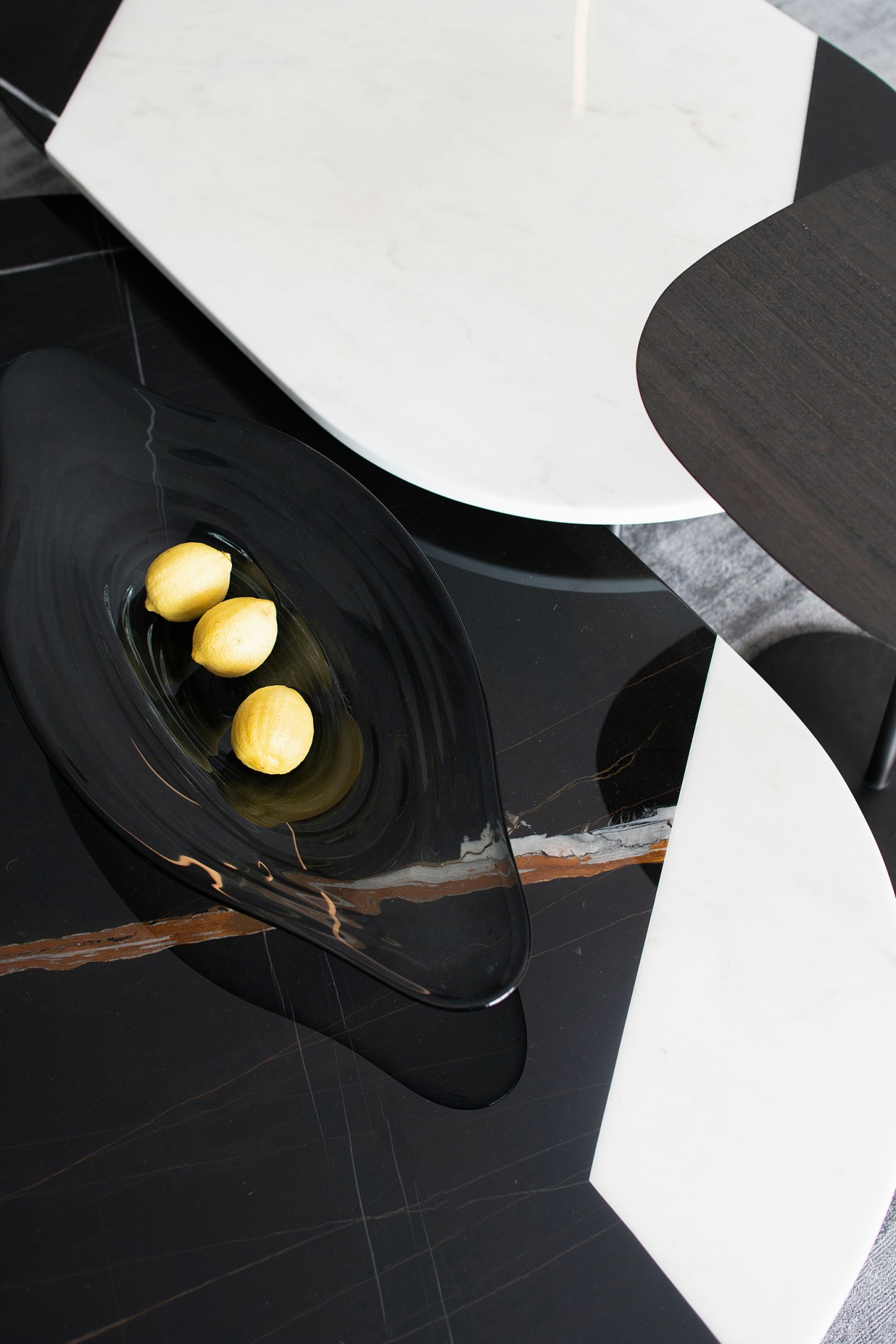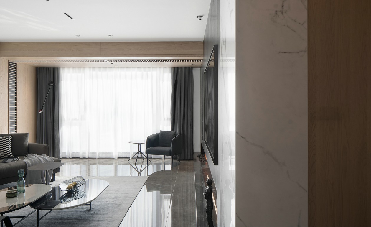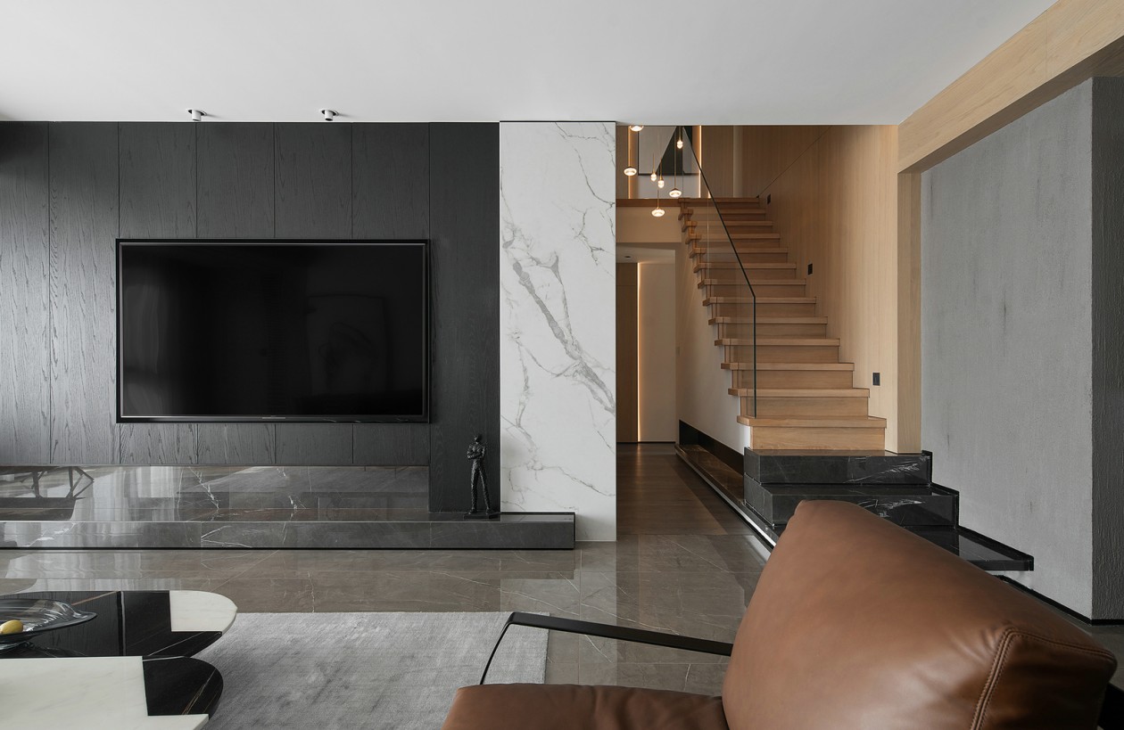 設計師用橡木原木和深灰橡木做舊作為會客空間的主色調,木質、石材、金屬相互穿插,強調了材質之間的形體關系。