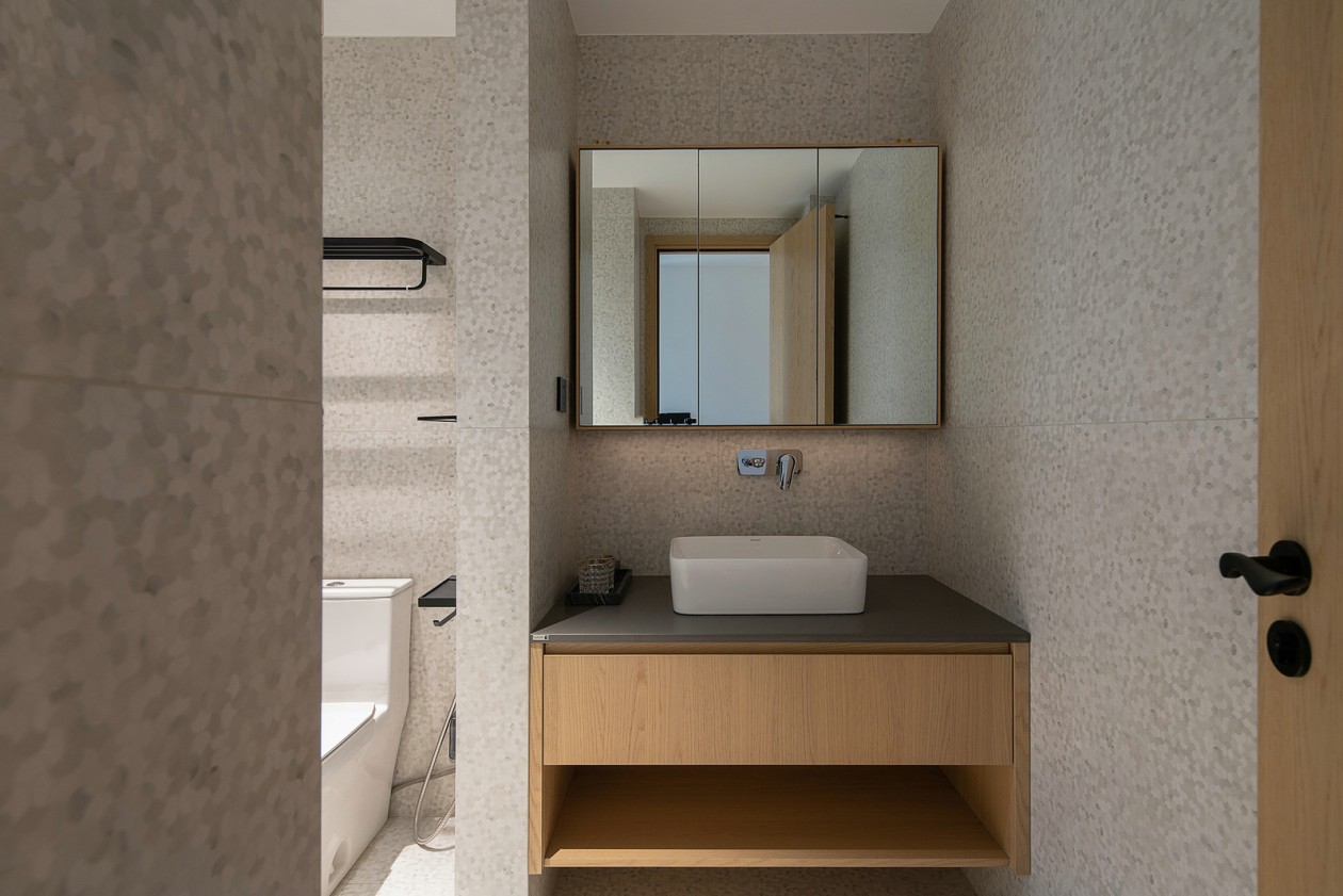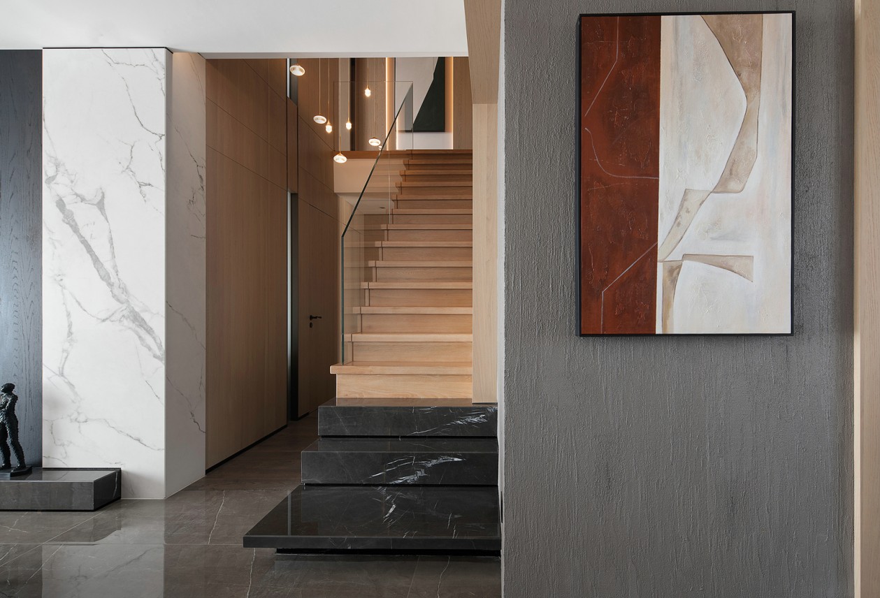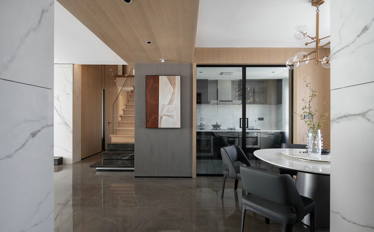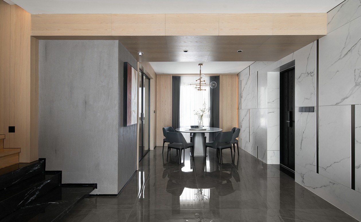 入口后的視覺匯聚在一面粗糙質感的墻面上,水泥質感的墻面和原色質感的木飾面跟大自然相互貼合,表達當代的生活氣息。