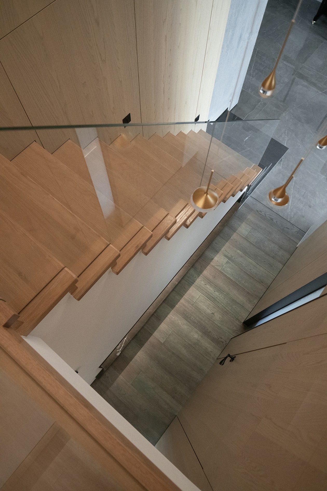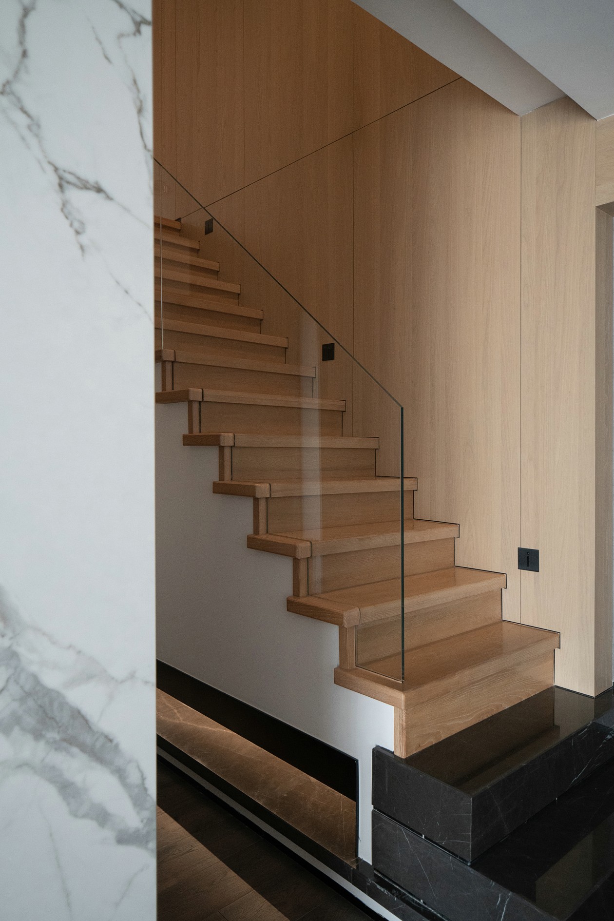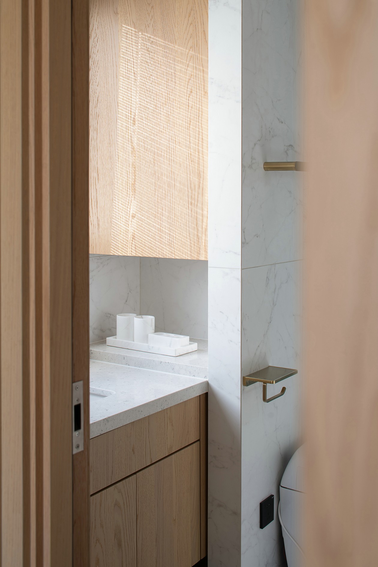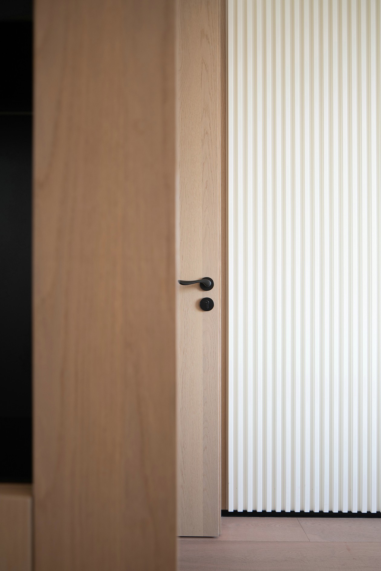 入口后的視覺匯聚在一面粗糙質感的墻面上,水泥質感的墻面和原色質感的木飾面跟大自然相互貼合,表達當代的生活氣息。