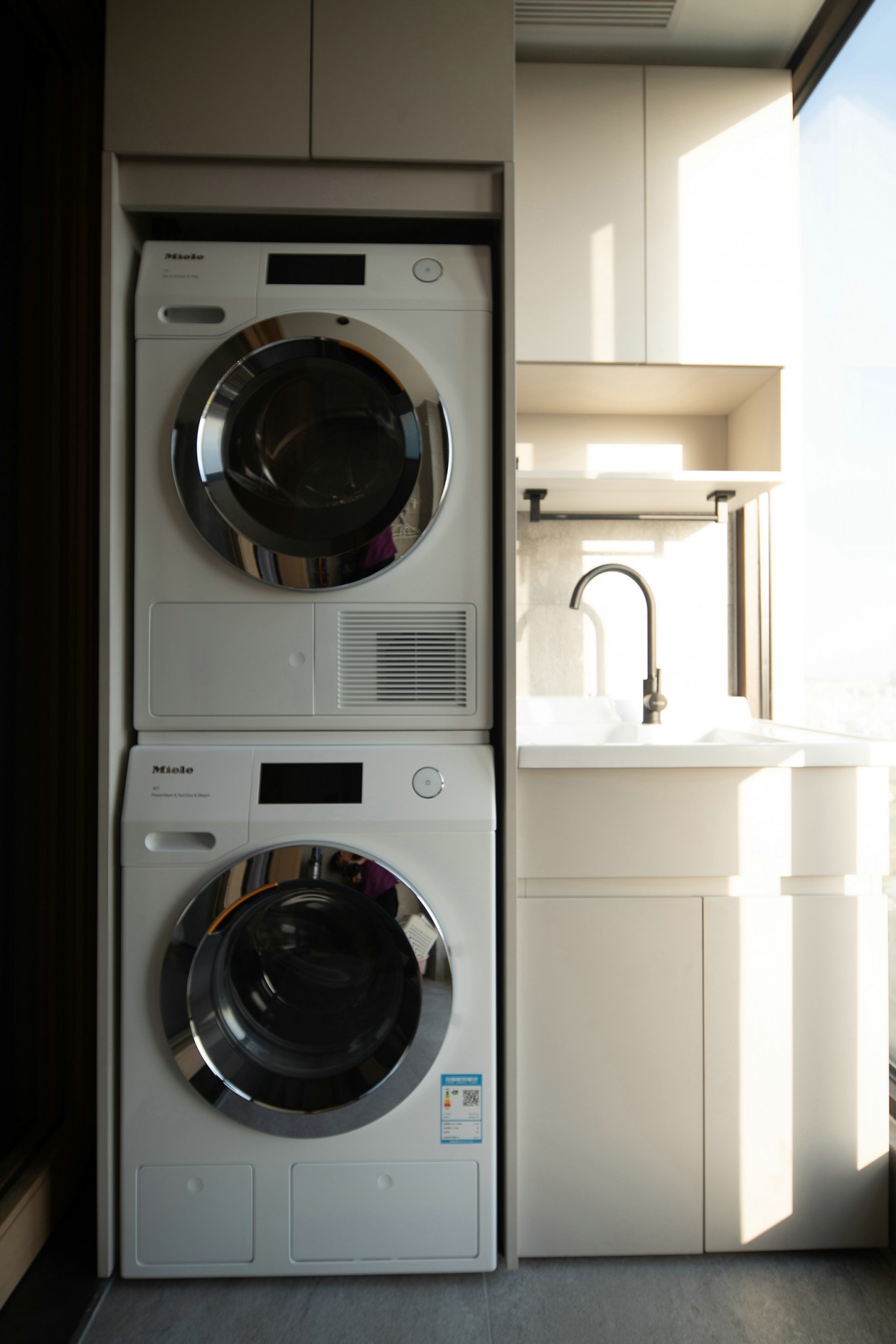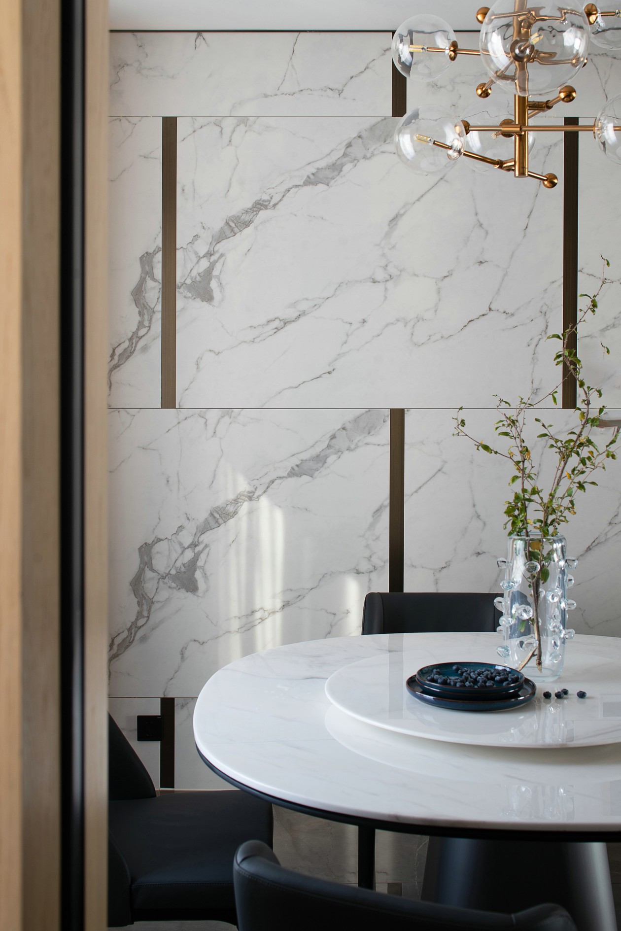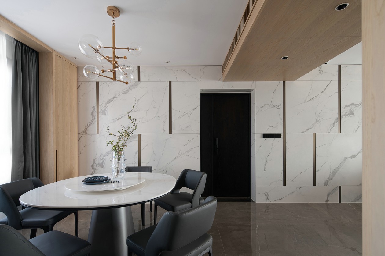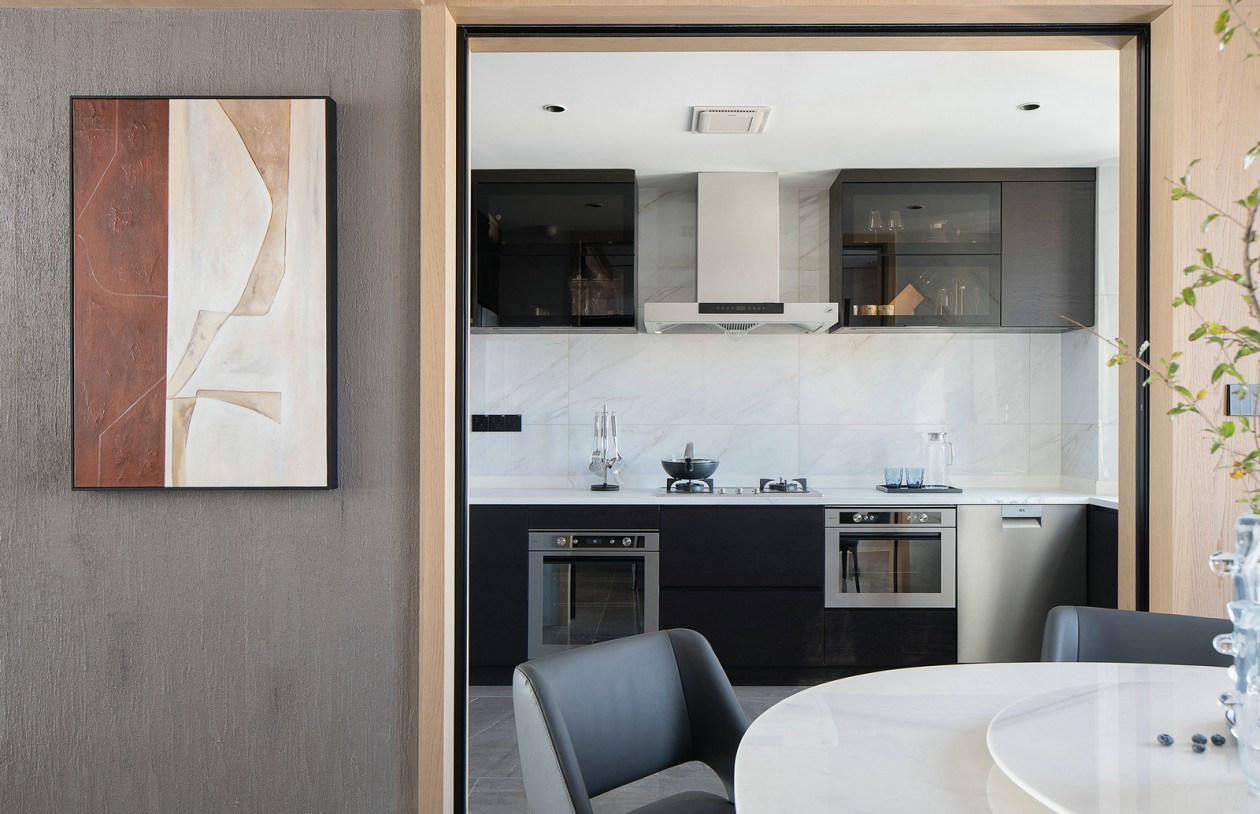 餐廳沿襲客廳的設計感,白色巖板與金屬錯縫拼接。穿插與整體尋覓到微妙的平衡,這里也是家人們卸下盔甲傳遞關懷的舒展空間。