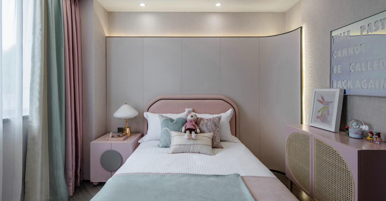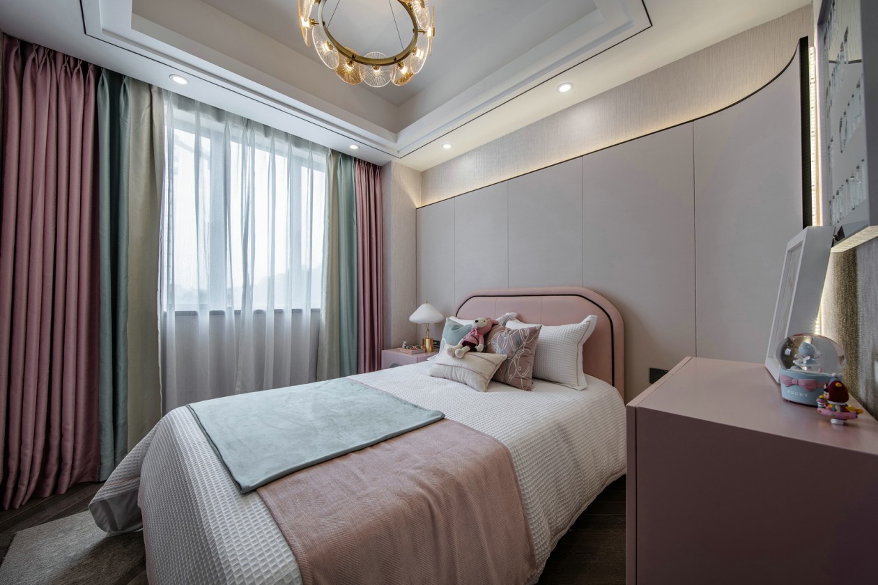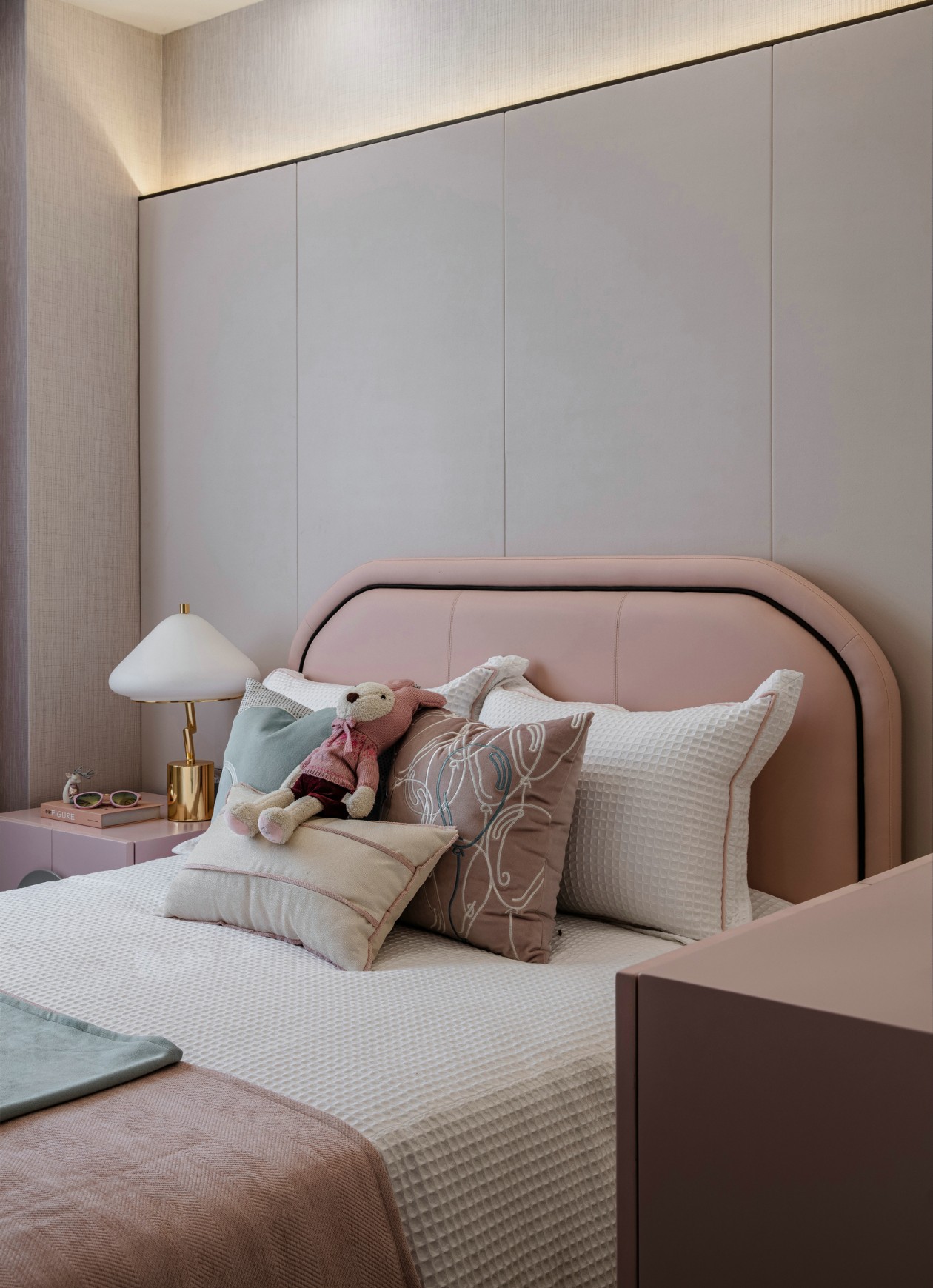 女孩房內點綴夢幻粉,素雅的空間中釋放著澎湃的生命氣息,席卷心靈,墻面線條簡練利落,保持大面積玻璃窗,強化了場所的穿透感,接受陽光更為純粹的洗禮。