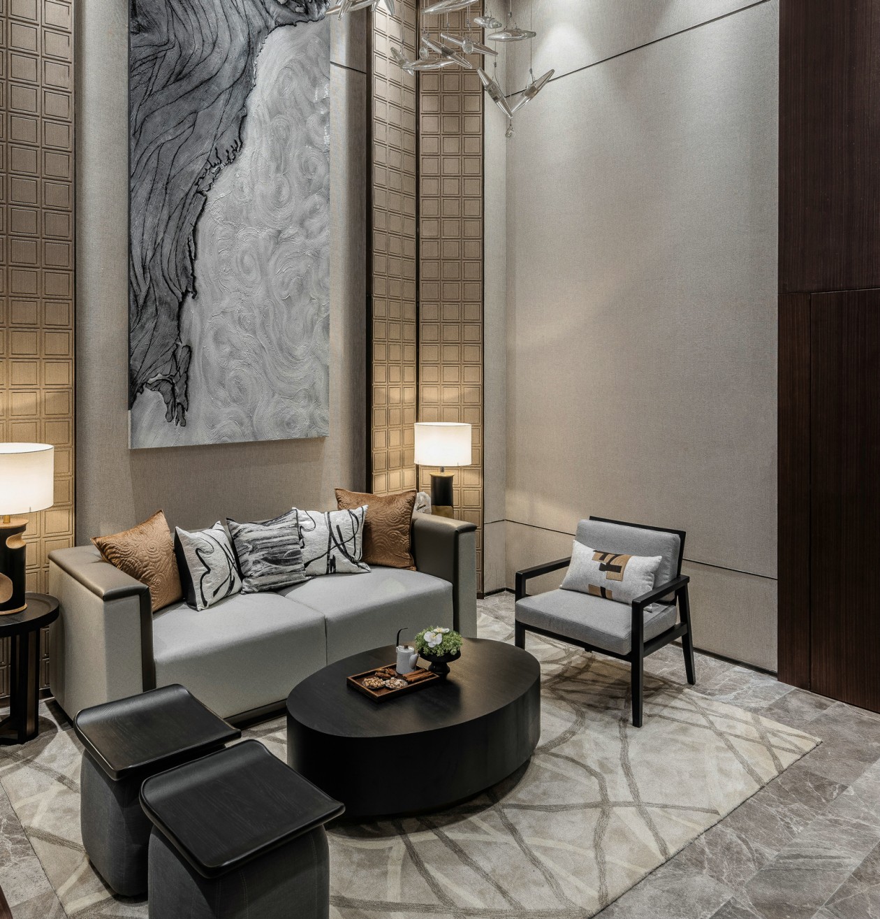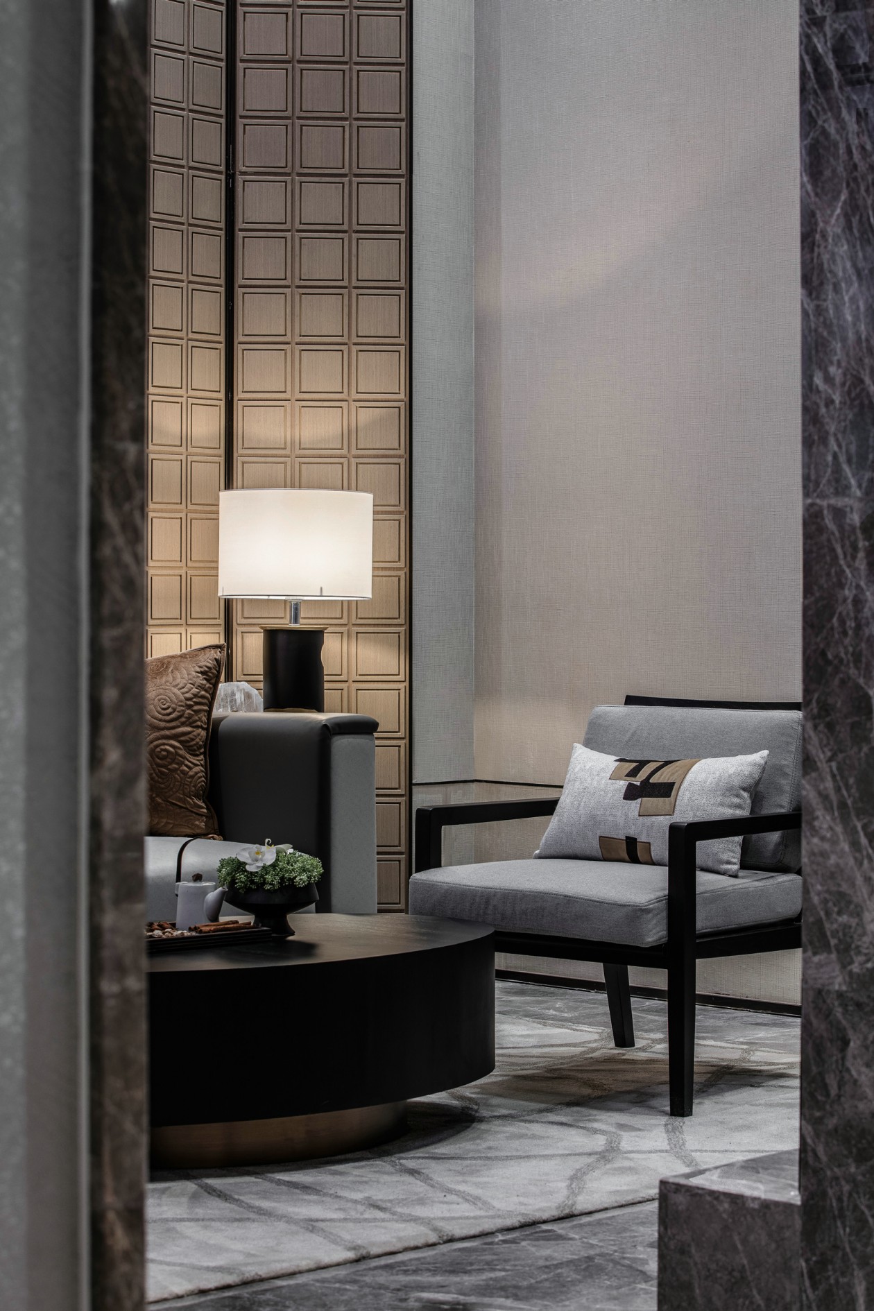 多功能休息廳中,一種中式的有序美再次體現,在軟硬之間、明暗與次序之間,透露出中式的極致審美追求。