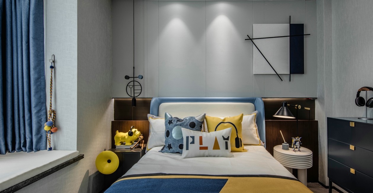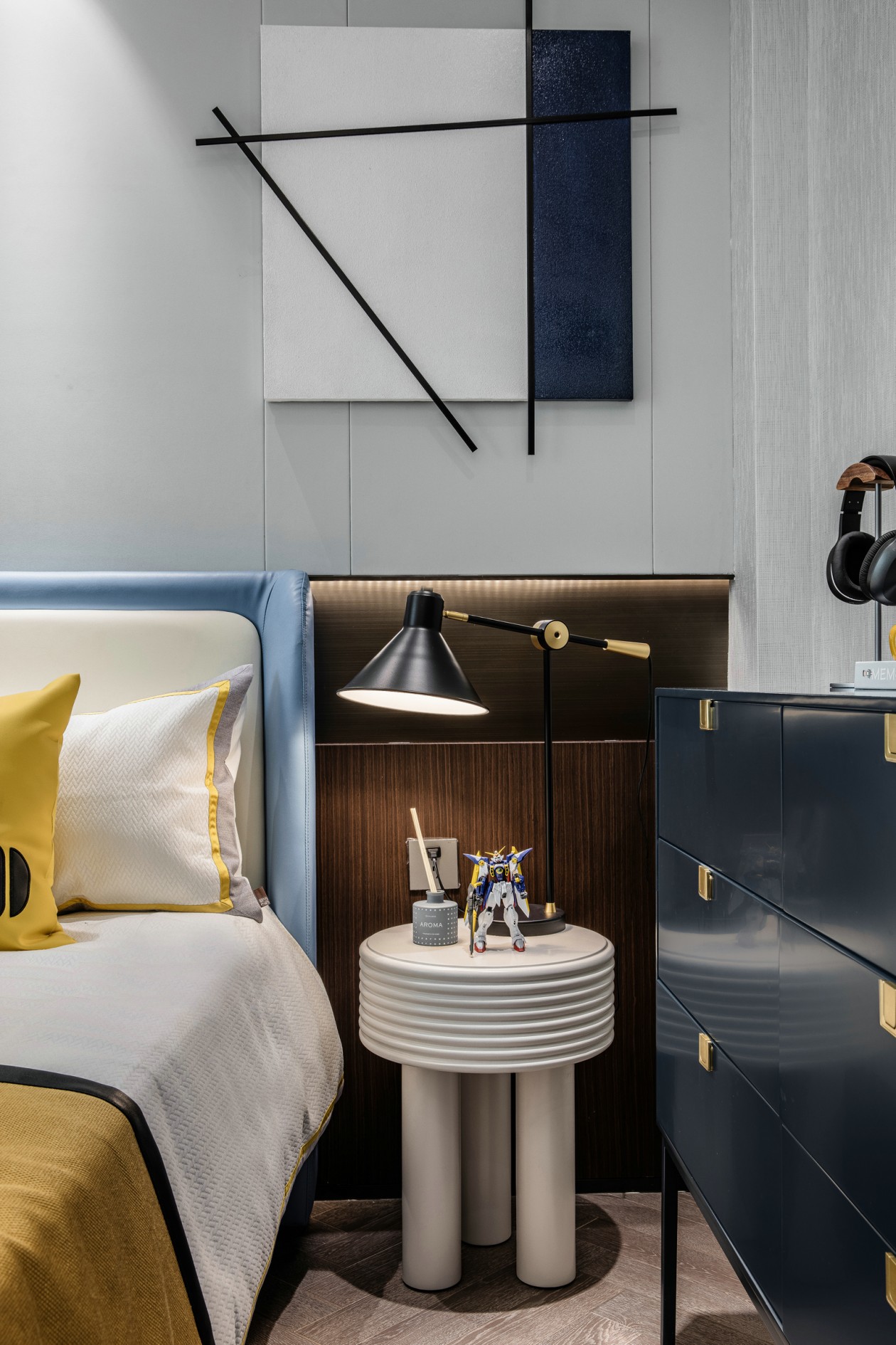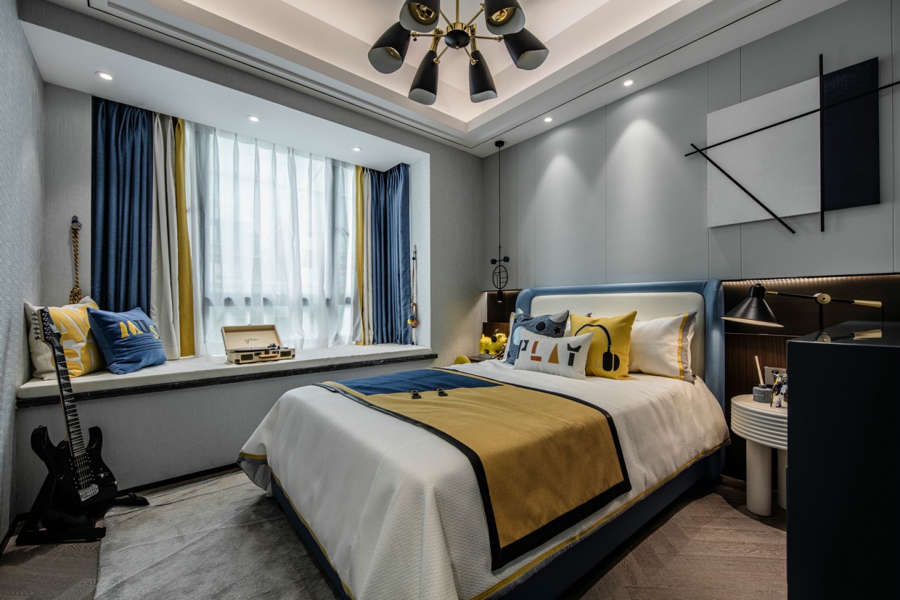 與女孩房相比,男孩房的設計元素更加活潑跳動,一架電子吉他的擺放,可以增加孩子對藝術的理解,對音樂的熱愛,簡約又不失靈動的空間,豐富了他們生活的同時又滿足了他們的夢想。