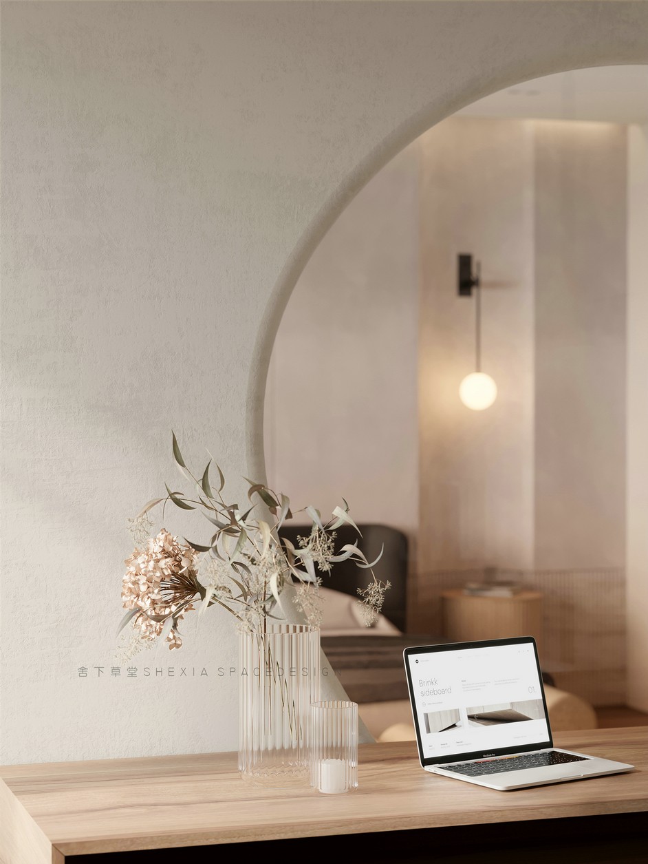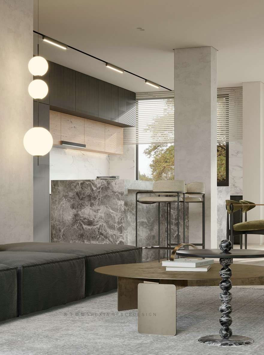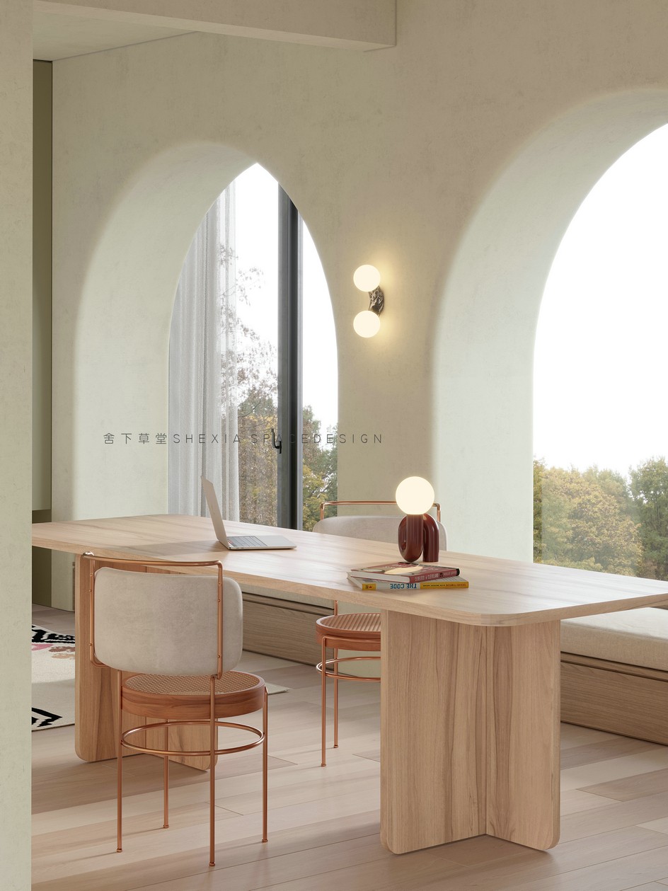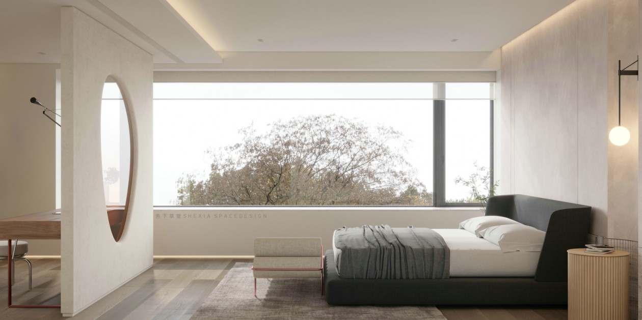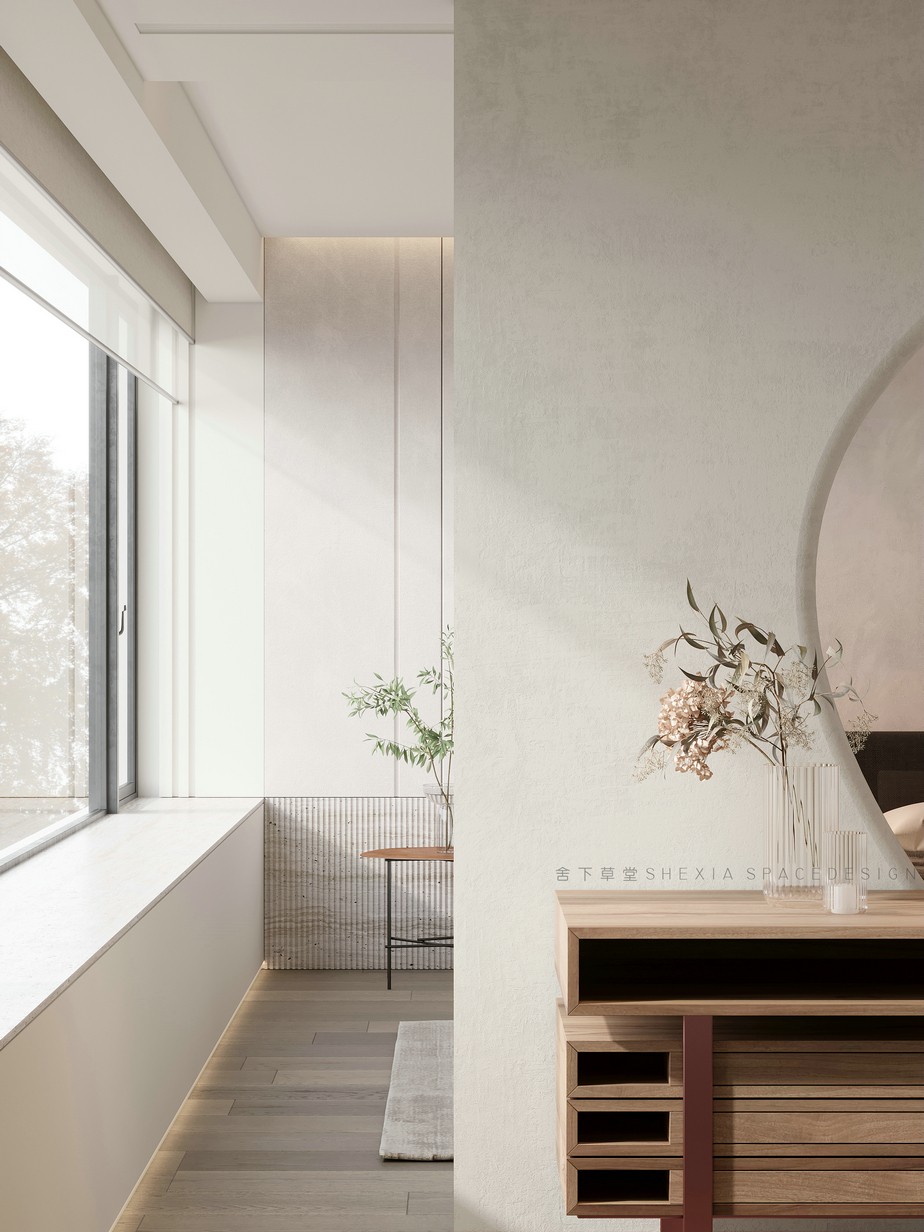 我希望空間是流動(dòng)的,無(wú)論是氣、光或者是情感,他們?cè)谧∷牟煌恢卯a(chǎn)生不同融合的化學(xué)反應(yīng)??蛷d、餐廳與廚房完全打通,鼓動(dòng)生活在其中的人互動(dòng)與聯(lián)系,增加交流。大面積的開(kāi)窗把陽(yáng)光引入室內(nèi)的同時(shí),使用者與自然充分親近,放松且悠然。也帶來(lái)了感受云展云舒、日出日落、覺(jué)察一枝一葉的萌發(fā)與凋零的生活體驗(yàn)。
