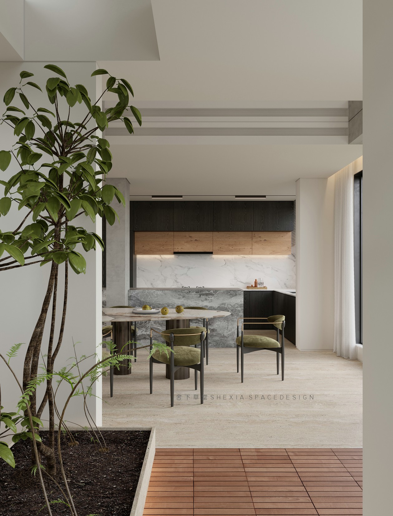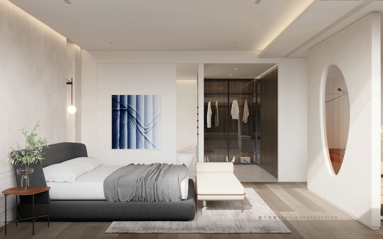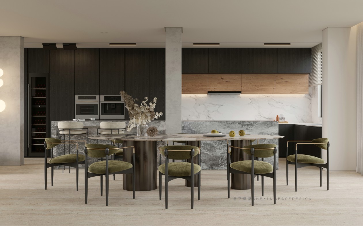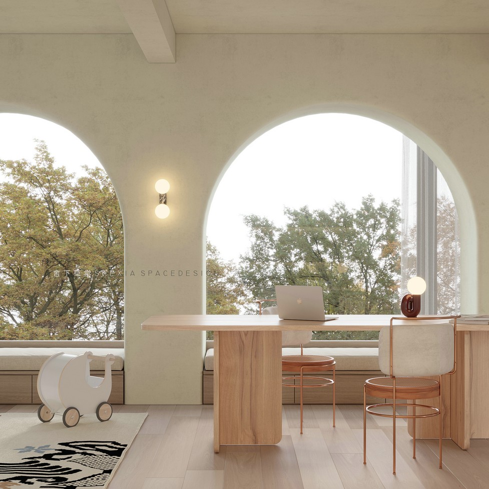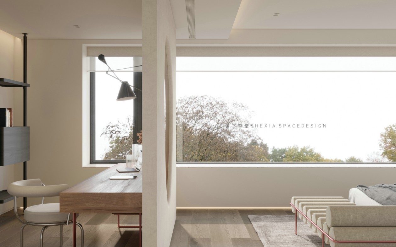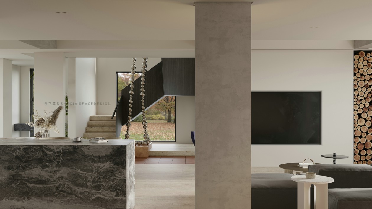 我希望空間是流動(dòng)的,無(wú)論是氣、光或者是情感,他們?cè)谧∷牟煌恢卯a(chǎn)生不同融合的化學(xué)反應(yīng)??蛷d、餐廳與廚房完全打通,鼓動(dòng)生活在其中的人互動(dòng)與聯(lián)系,增加交流。大面積的開(kāi)窗把陽(yáng)光引入室內(nèi)的同時(shí),使用者與自然充分親近,放松且悠然。也帶來(lái)了感受云展云舒、日出日落、覺(jué)察一枝一葉的萌發(fā)與凋零的生活體驗(yàn)。