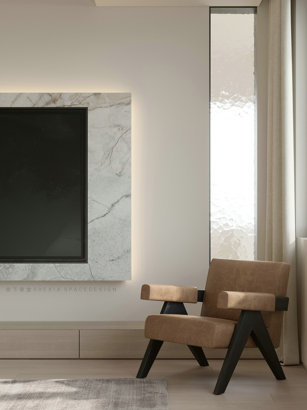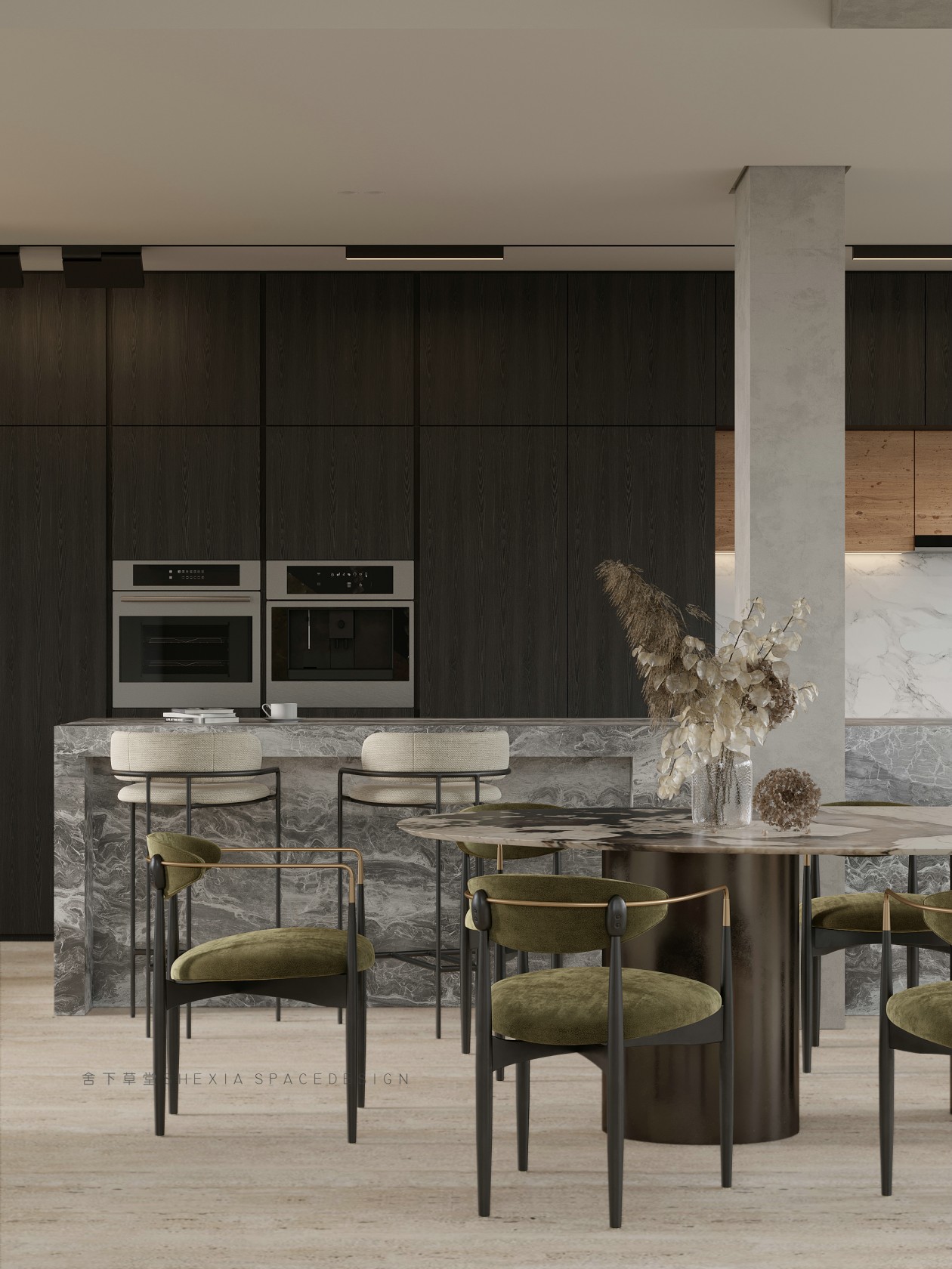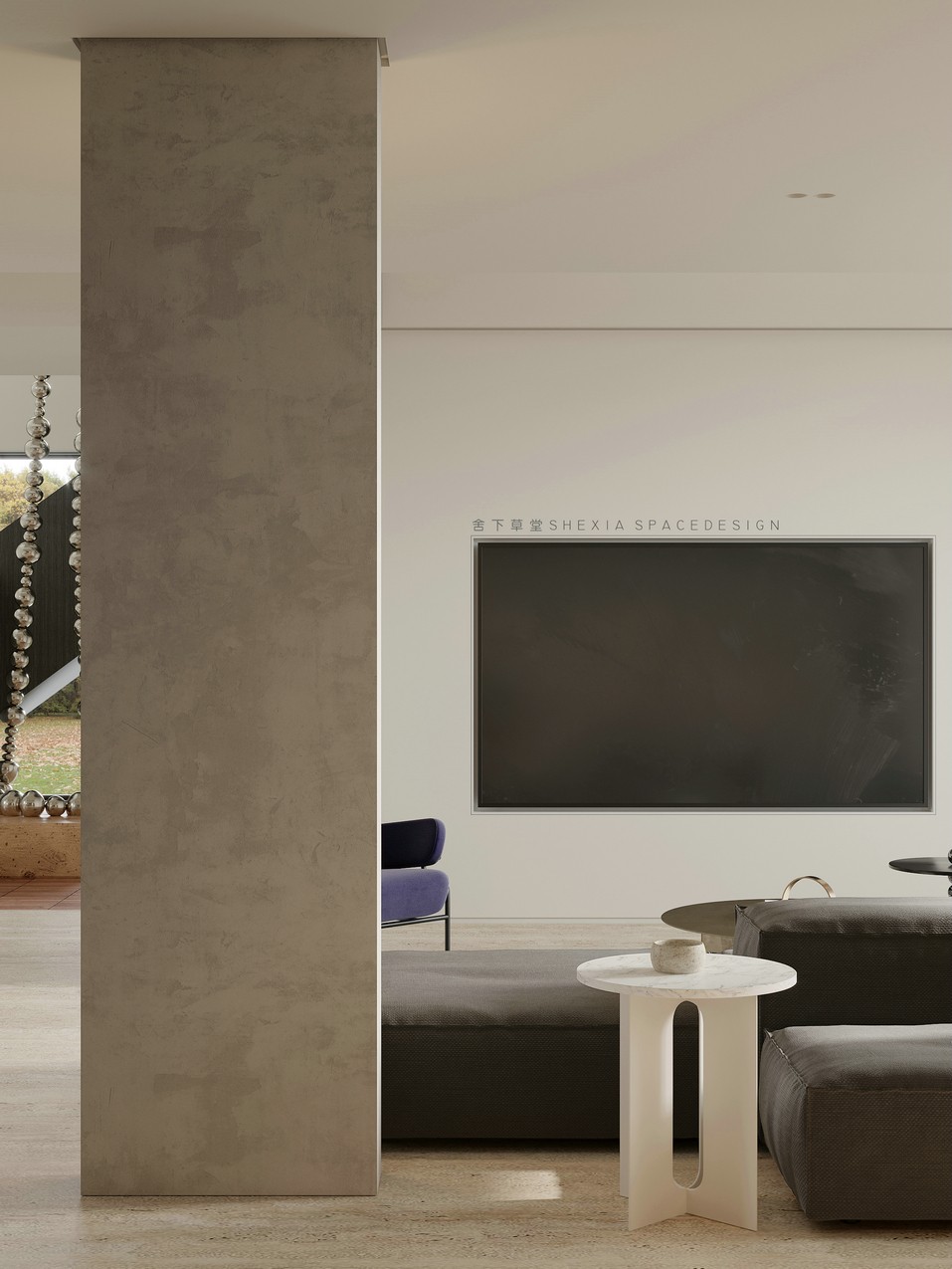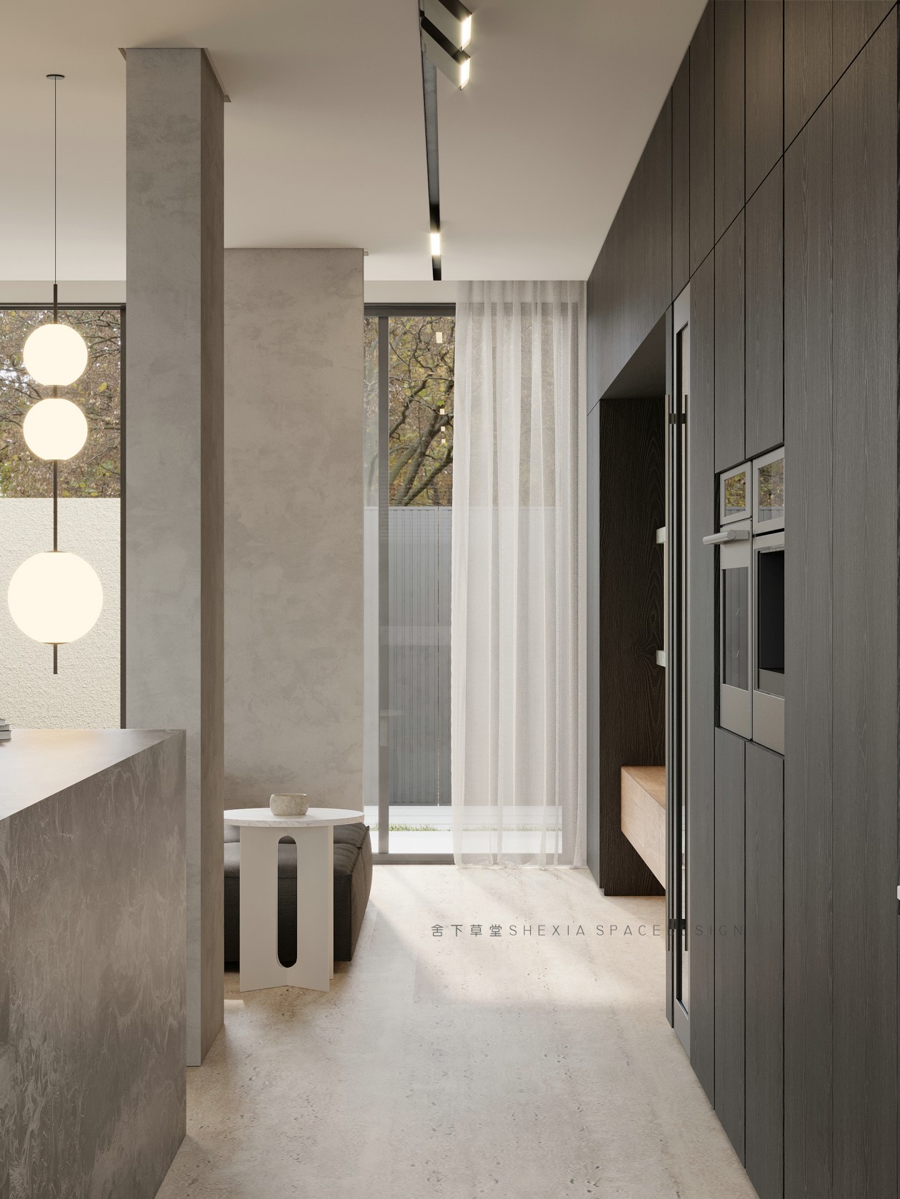 我希望空間是流動(dòng)的,無(wú)論是氣、光或者是情感,他們?cè)谧∷牟煌恢卯a(chǎn)生不同融合的化學(xué)反應(yīng)??蛷d、餐廳與廚房完全打通,鼓動(dòng)生活在其中的人互動(dòng)與聯(lián)系,增加交流。大面積的開(kāi)窗把陽(yáng)光引入室內(nèi)的同時(shí),使用者與自然充分親近,放松且悠然。也帶來(lái)了感受云展云舒、日出日落、覺(jué)察一枝一葉的萌發(fā)與凋零的生活體驗(yàn)。